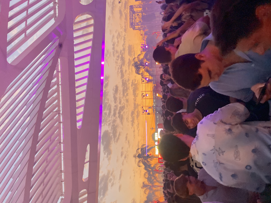 An outdoor event with a large crowd is visible, likely a concert or festival, illuminated by stage lighting. A structure, possibly a modern building or art installation, featuring parallel slats and white framework, occupies the left side of the frame, casting shadows in a linear pattern. The sky shows a colorful sunset with clouds. Many attendees are visible, most with dark hair and casual clothing, facing towards the stage.
