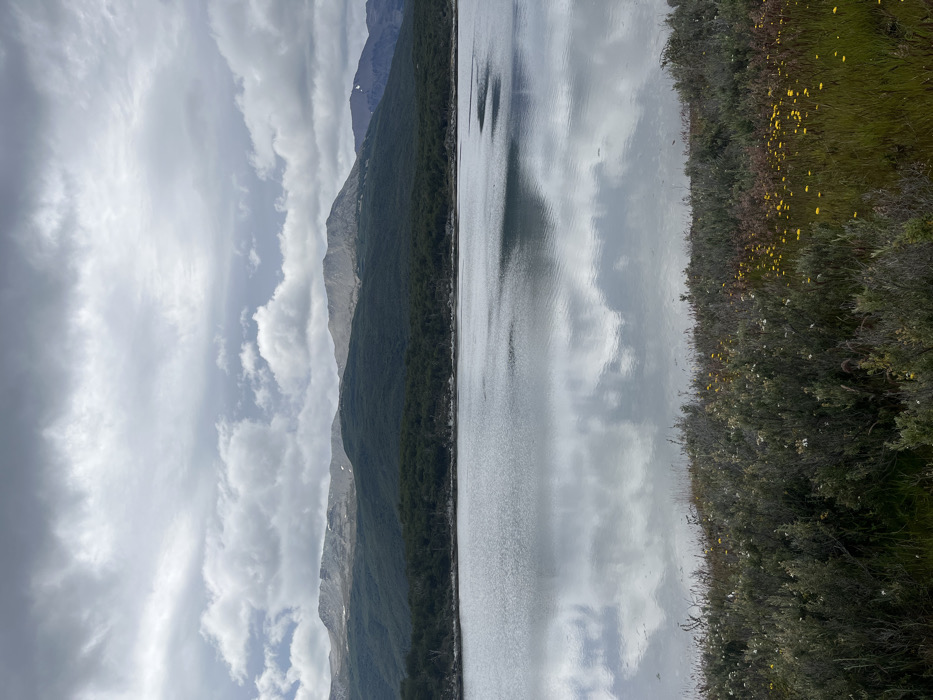 The landscape features a body of water reflecting the sky's cloudy visage. Mountains rise on one side, their slopes covered in dense forest. The opposite bank is a mix of green grass dotted with small yellow flowers and denser shrubs. The sky is predominantly gray, filled with varied cloud formations that contribute to the reflection in the water, giving the scene a serene, almost mirrored effect.