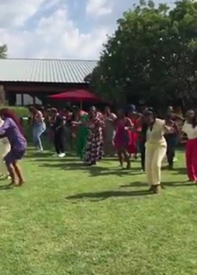 A group of women are dancing on a grassy lawn, seemingly having fun, under a partly cloudy sky. Some of the women are wearing brightly colored outfits. In the background, there is a building with a metal roof and a red umbrella. A man in a white shirt passes in front of the camera, obscuring the view for a moment. The overall setting appears to be an outdoor event or gathering.