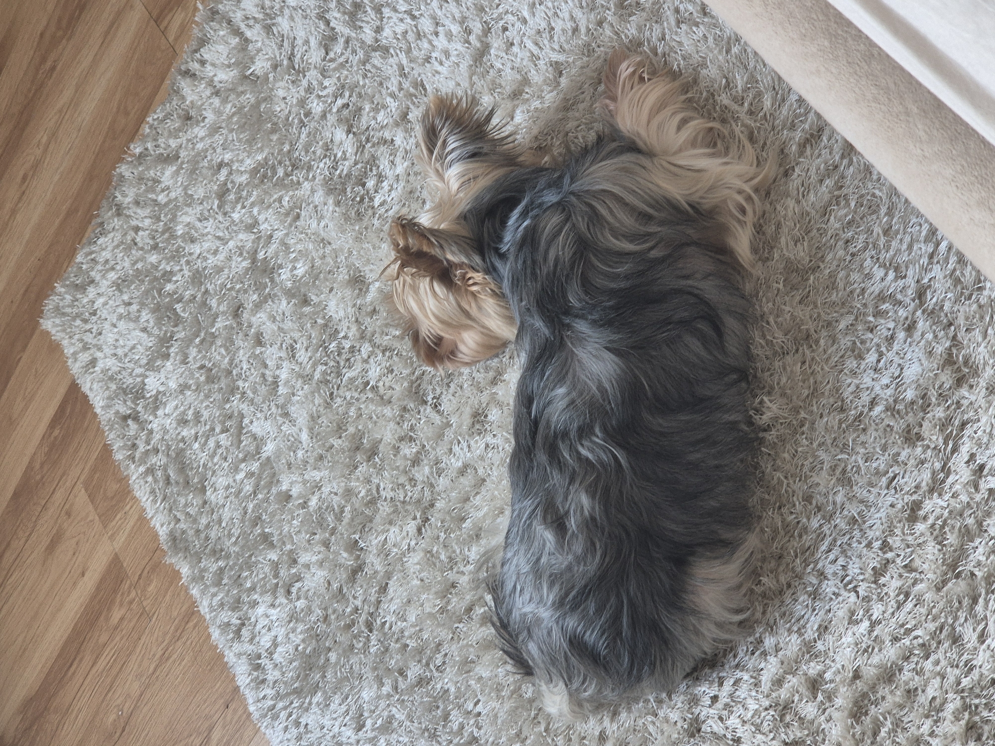 A Yorkshire Terrier dog is observed resting indoors, specifically in a room in the city of Pavlikeni, Bulgaria. The dog is lying on its left side on a thick, shaggy, light-colored (off-white/cream) rug, positioned centrally within the frame. Its fur exhibits a dark grey and silver pattern across its body, transitioning to a light tan and golden color on its head, ears, and lower extremities. The dog's head is turned backward, with its right ear prominently visible and perked. Its front paws are tucked, and a hind leg is partially visible. The rug covers the majority of the floor, while light-brown wooden plank flooring is visible along the upper left edge and corner, laid diagonally. A cream-colored upholstered object, likely furniture, is partially visible along the lower right edge of the frame.