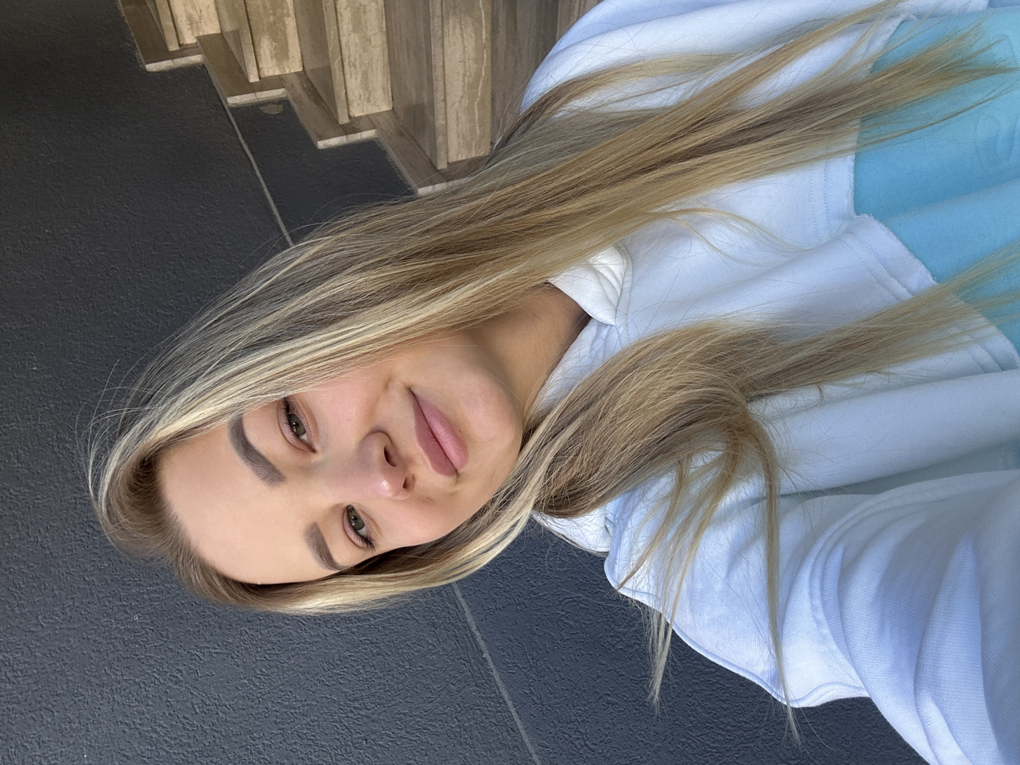 A fair-skinned woman with long blonde hair lies on a dark gray textured surface, seemingly concrete or asphalt. She is wearing a white and blue hooded sweatshirt. In the background, textured light brown vertical elements are visible, possibly steps or a wall. The image orientation is sideways. The location might be in Budva, Montenegro, but no recognizable landmarks are present to confirm it.