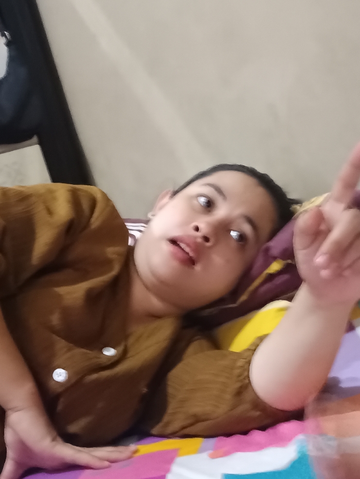 A woman reclines on a bed covered with a colorful patterned sheet. Her head rests on a purple and yellow pillow. She wears a button-down shirt. Her right hand extends towards the camera, index finger pointing upward. A black object is partly visible in the upper left corner. The background is a plain wall. The woman is looking up and slightly to her right, with her mouth slightly open.