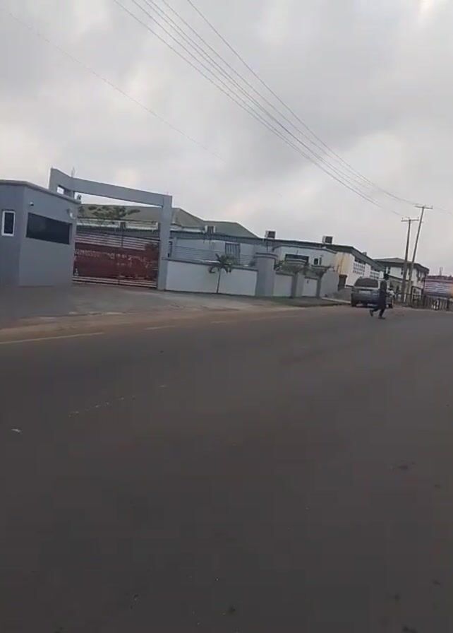 street scene on an overcast day. A grey building with a red gate stands behind a grey wall. A person walks across the street in front of the building, and a dark-colored SUV is parked further down the street. Power lines run overhead.