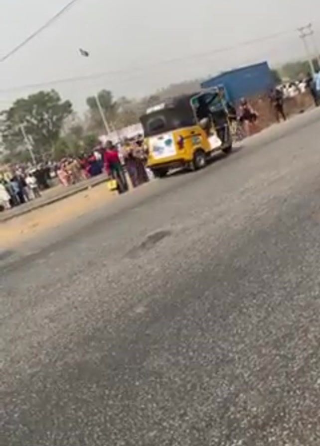 roadside scene with a crowd of people, mostly women, gathered near a road. There's a yellow and black auto-rickshaw to the left, and a blue truck is parked further down the road. Many people are standing on the shoulder of the road, while others are walking along the road. The sky is overcast and the surrounding environment appears to be a rural or semi-rural area with trees in the background. The road is paved and appears to be well-used. There is a sign at the side of the road which is only partially visible.