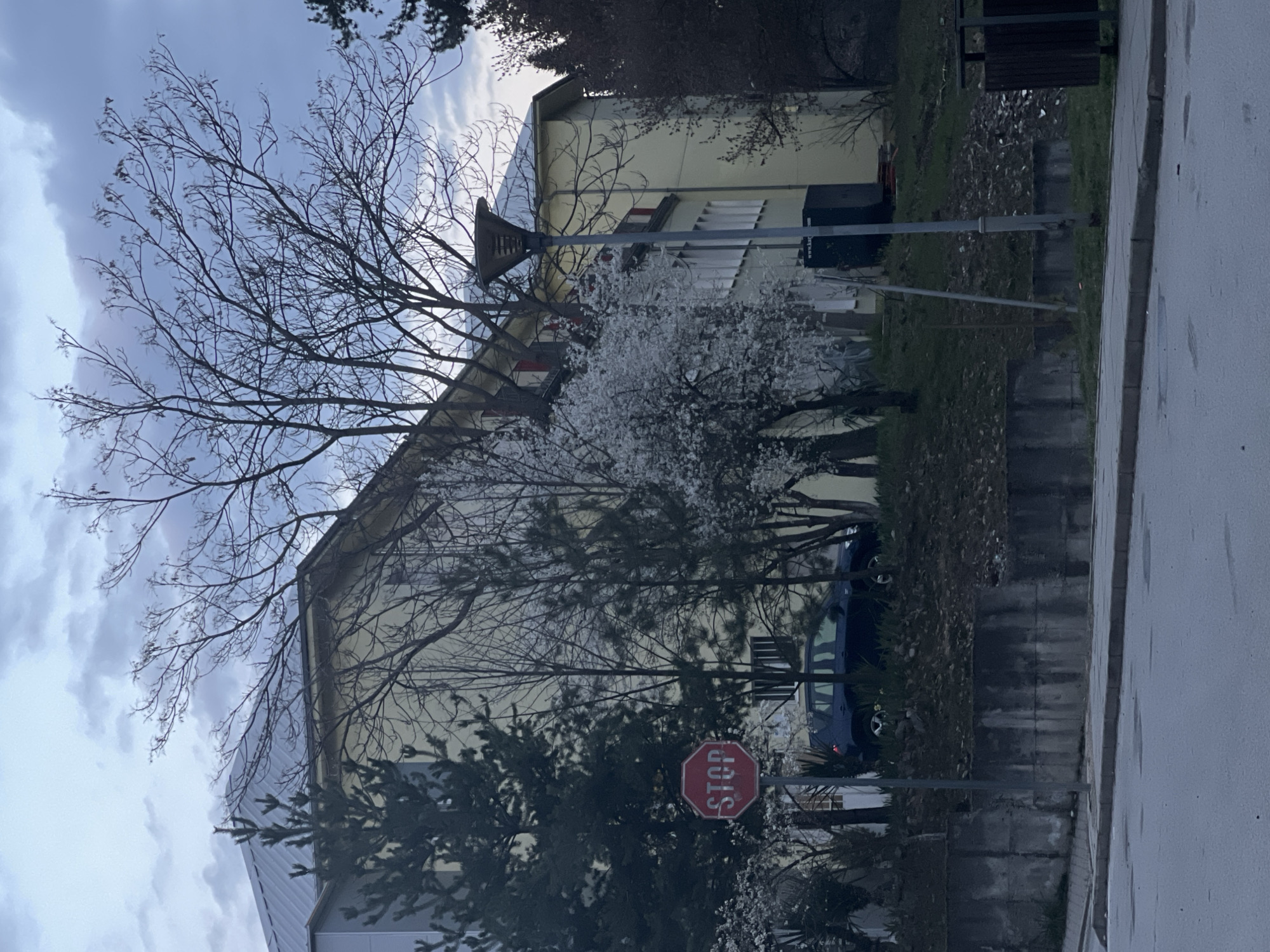 The scene depicts an outdoor urban environment in Goce Delcev, Bulgaria, under an overcast sky with blue and gray clouds. In the foreground, a wet asphalt street runs left to right, bordered by a concrete curb and sidewalk. A concrete retaining wall separates the sidewalk from a higher, upward-sloping grassy area. A red octagonal STOP sign with white lettering is positioned on a pole in the left-center of the image, near the retaining wall. Behind this wall, on the sloped terrain, a dark blue compact SUV is parked, partially obscured by various trees and bushes. The vegetation includes several deciduous trees with bare branches, evergreen pine trees, and multiple trees actively blooming with white flowers. In the midground, a large, multi-story building with a light yellow facade and a gray metal pitched roof occupies the upper portion of the scene. Multiple windows are visible, some with closed blinds, and red accents are present on upper-level architectural features. A portion of another light gray building with a similar roof is visible to the left. On the right side of the image, a tall, dark gray street light pole with a distinctive angular fixture extends upwards from the sidewalk level. Behind the street light, a large dark rectangular utility box or dumpster is visible on the grassy slope. A dark wooden slatted trash bin is partially visible on the far right at street level. No individuals are present in the depicted scene.