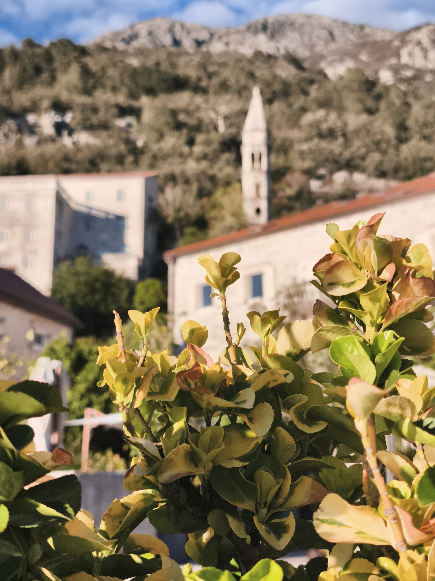 close-up of a shrub with variegated green and yellow leaves in the foreground. Behind the shrub, the buildings of Perast, Montenegro, are visible, including a church tower. The background shows a mountain. The sky is blue with scattered clouds. The buildings appear to be made of stone or concrete. The image captures a scene in Perast, Montenegro.