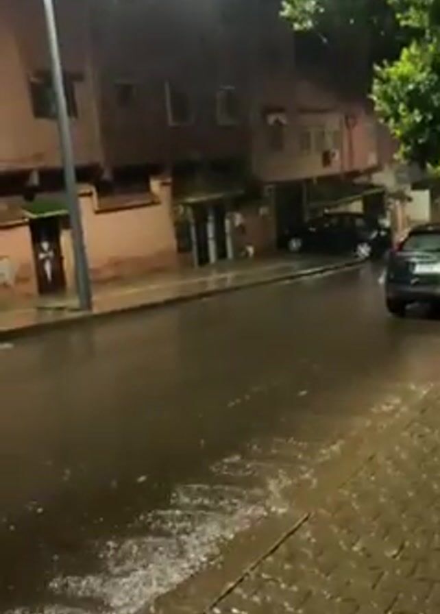 street scene at night during heavy rain. The street is wet and reflective under the illumination of a street light. Buildings line the street, appearing to be multi-story apartments with a reddish-brown facade. Several parked cars are visible on the side of the street. Trees with green leaves stand to the right of the frame. The camera pans slightly from left to right.