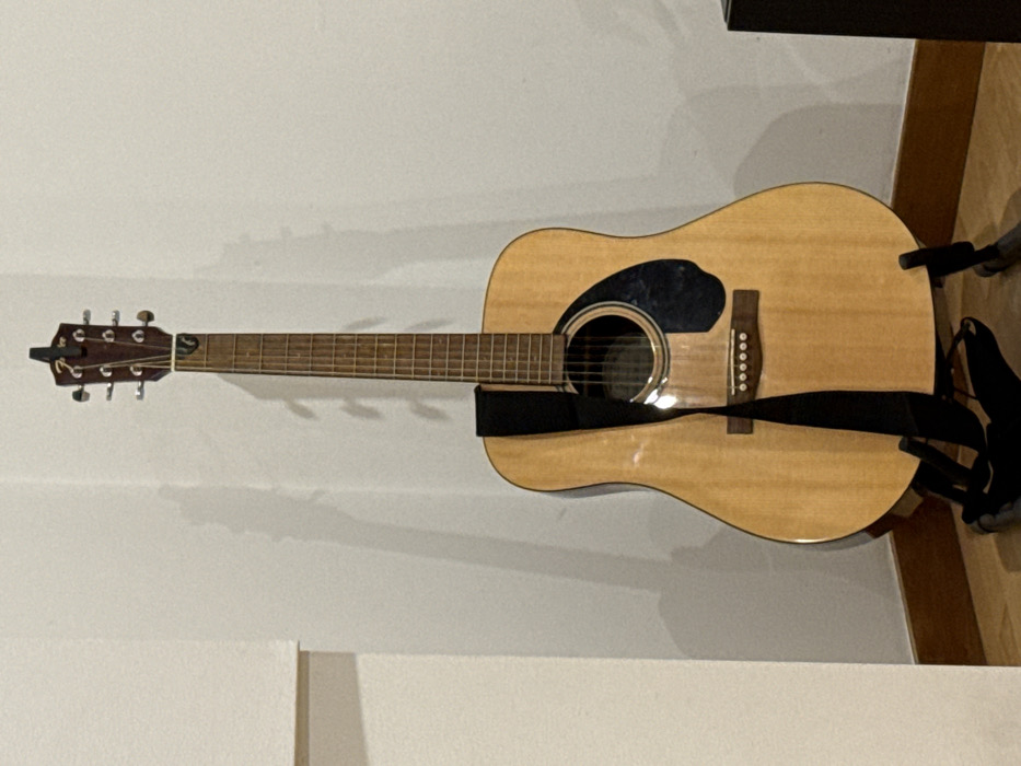 - "An acoustic guitar stands upright on a black metal guitar stand in an interior corner of a room in Mealhada, Portugal" by FM-k1rMm1, licensed under CC BY 4.0