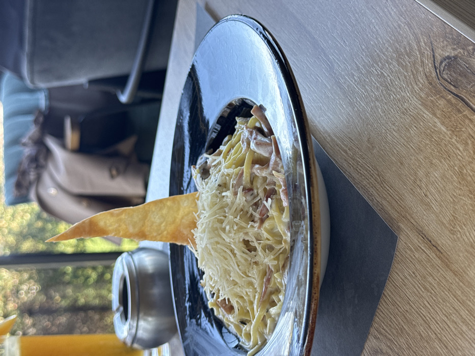 The image captures a static, close-up, eye-level view of a prepared meal on a light-brown wooden table within an establishment in Haskovo, Bulgaria. A black ceramic bowl, featuring a wide, glossy rim and a white underside, occupies the central foreground, containing a portion of pasta. The pasta consists of light-colored strands (likely tagliatelle or fettuccine) mixed with a creamy sauce and numerous irregularly shaped pieces of cooked pinkish-brown meat, consistent with bacon or ham. A generous layer of grated pale yellow cheese covers the pasta. A single, tall, triangular, golden-brown crisp, possibly a fried pasta chip, is vertically inserted into the center of the dish. The bowl is positioned on a rectangular dark grey placemat. To the left, partially out of frame, a stainless steel lidded ashtray and a glass holding an orange liquid are present. The background, largely out of focus, reveals elements of the establishment's interior: the dark grey upholstered back of a chair is visible on the right, and a light-brown coat is draped over another chair or object further back. Green foliage is discernible outside a window in the blurred upper left quadrant, suggesting natural light illuminates the scene. No discernible human presence or activity is depicted.