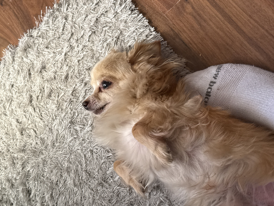 - "A small, long-haired tan and light brown dog is depicted lying on its back, belly exposed, on a light grey, shaggy carpet" by FM-F6F9k1, licensed under CC BY 4.0