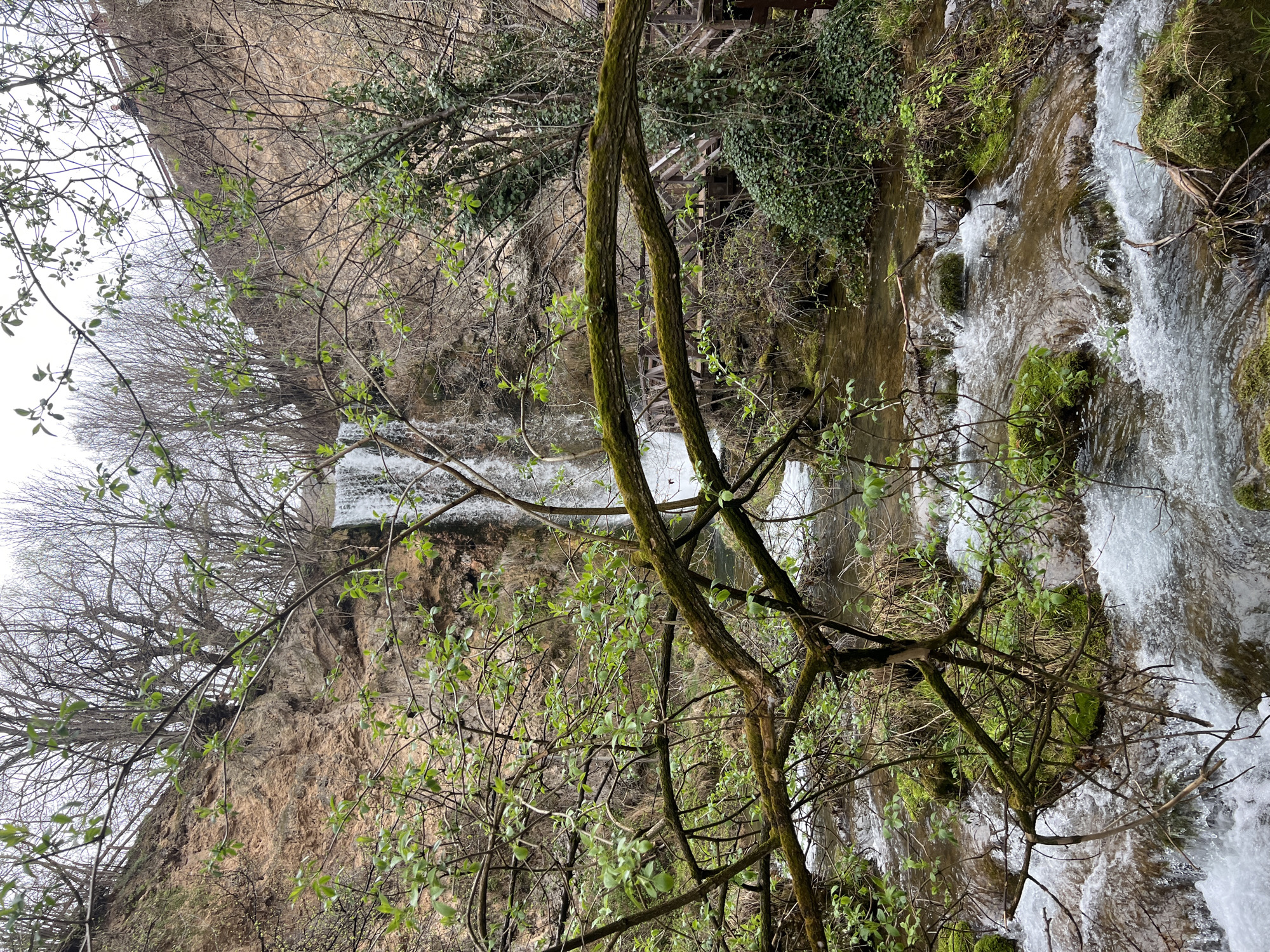 The image captures Veliki Buk waterfall (Lisine waterfall) within Despotovac Municipality, Serbia, viewed from a low angle looking upstream. A tall, narrow cascade of white water descends a steep, reddish-brown earthen cliff face. Below the waterfall, a turbulent stream flows rapidly over numerous rocks and moss-covered obstacles, creating white rapids and clear pools. The immediate foreground is dominated by a network of tree branches, many covered in green moss, displaying nascent green leaves. Beyond these, a mix of deciduous trees, some still largely bare and others budding, populate the banks and cliff slopes. On the right side, a wooden walkway or bridge is partially visible, integrated into the natural environment and suggesting a visitor path. At the very top edge of the cliff, a subtle railing is present, near which a single individual is faintly visible, observing the scene below. The sky is overcast, providing diffuse lighting.