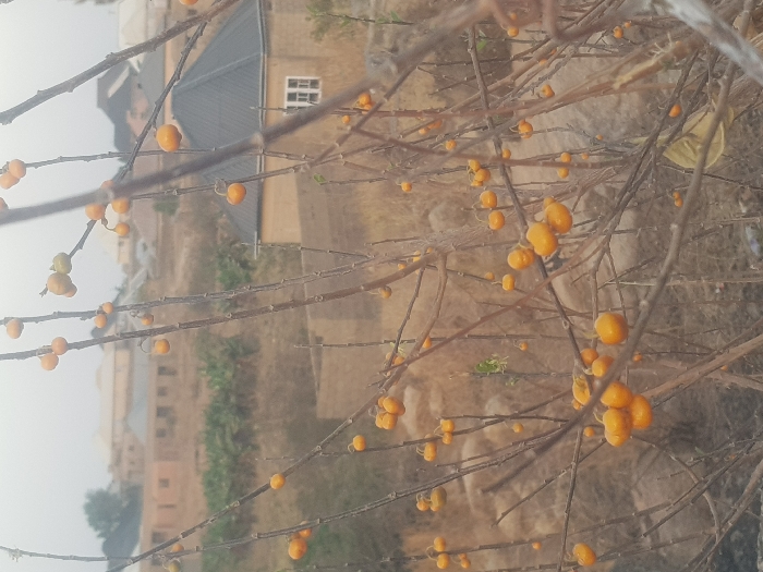 A close-up shows bare branches with numerous small, round, yellow-orange fruits, resembling berries, attached to the twigs. The background features buildings with a dark roof visible through the branches. The landscape has a faded, dry appearance. The overall composition suggests a winter or dry season scene with ripe berries on a deciduous tree.