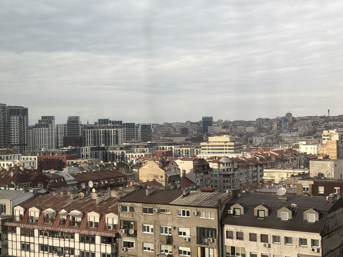 An expansive urban landscape of Belgrade, Serbia, is viewed from an elevated perspective under an overcast, light grey sky