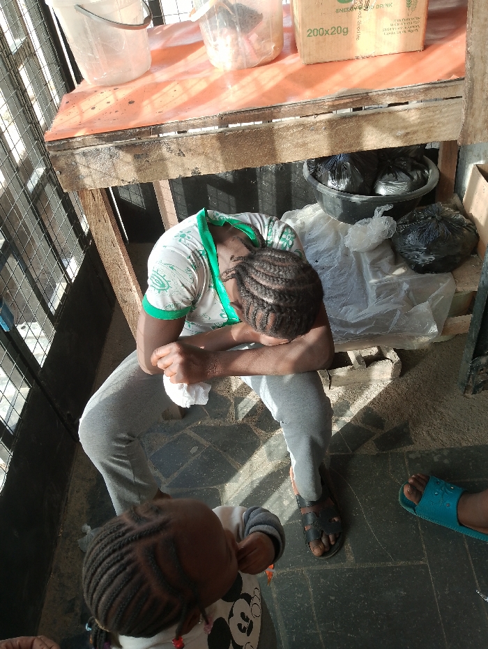 The image depicts an informal indoor or semi-outdoor scene in New Nyanya, Nigeria, illuminated by strong daylight that creates distinct shadows. An adult male figure, wearing a white short-sleeved t-shirt with green trim and light grey sweatpants, is seated on a low, rough wooden structure. His head is down, forearms rest on his knees, and he holds a crumpled white cloth in his hands. He has dark braided hair and wears dark open-toed sandals. In the foreground, a young child stands with their back mostly to the camera, wearing a white long-sleeved top featuring a black Mickey Mouse graphic. The child also has dark braided hair. A portion of a third person's foot, shod in a light blue slide sandal, is visible on the right side of the frame. Above the seated adult, a crude wooden table with a reddish-orange tarpaulin top holds two clear plastic buckets, one containing light-colored granular material, and a brown cardboard box labeled "ENERGY DRINK, 200x20g." Beneath the table, a black plastic basin contains multiple black plastic bags, alongside additional black and white plastic bags arranged on a white plastic sheet on the dark tiled floor. A metal grid barrier, receiving direct sunlight, is visible on the left side of the scene.
