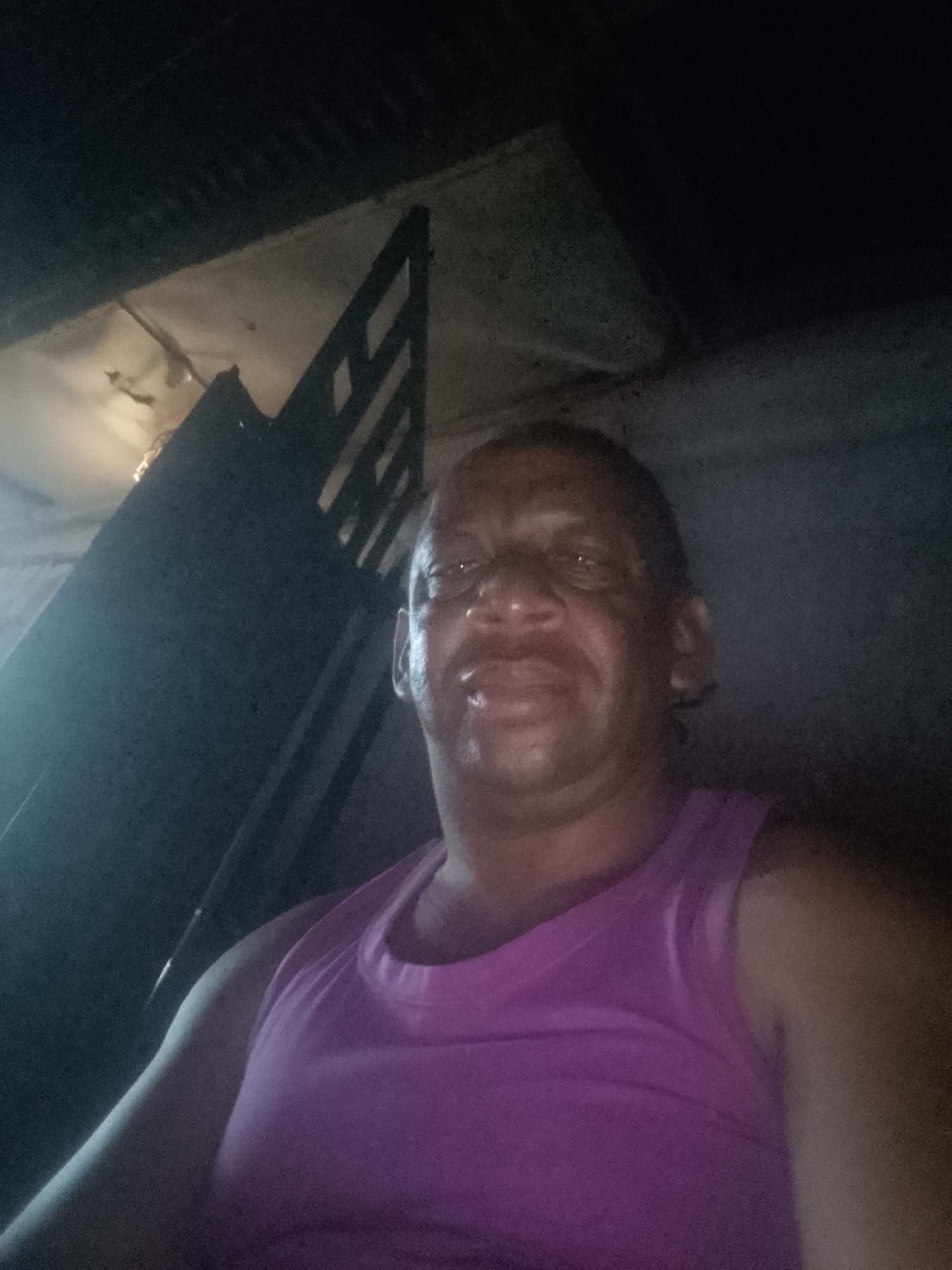 An adult Black individual is seen wearing a magenta tank top. The location appears dark, possibly indoors, with a partially visible dark structure in the background that may be made of wood. The individual is likely located in Sabon Tasha, Nigeria, given the location information. The overall lighting is low, making details difficult to discern.