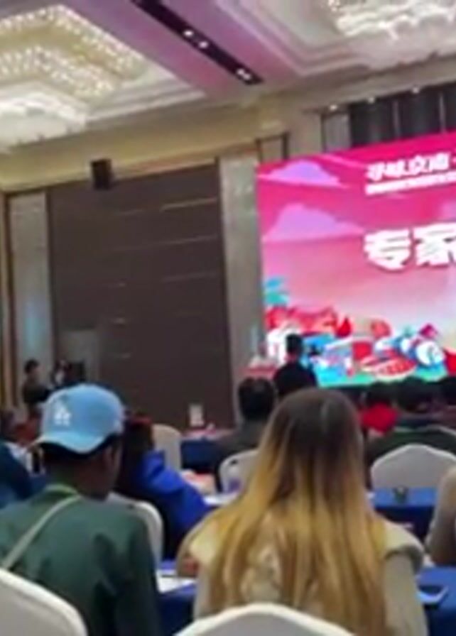 conference or meeting taking place in a large ballroom. Rows of seated attendees face a stage with a large screen displaying a colorful graphic in Chinese characters. There are people milling about in the back of the room near tables set up with what appears to be food. The room is well-lit with chandeliers and built in wall lighting.