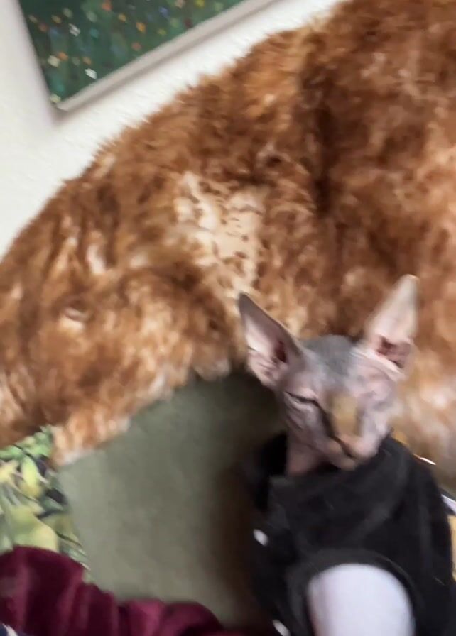 woman lying on a sofa. She has dark hair and is wearing a burgundy robe. A Sphynx cat wearing a black jacket with a yellow design is next to her. Behind the woman and cat is an orange fur rug, and a piece of artwork hangs on the wall. A partially visible door frame and light switch can be seen. The camera is angled, showing the scene from above. The woman appears to be sleeping or resting.