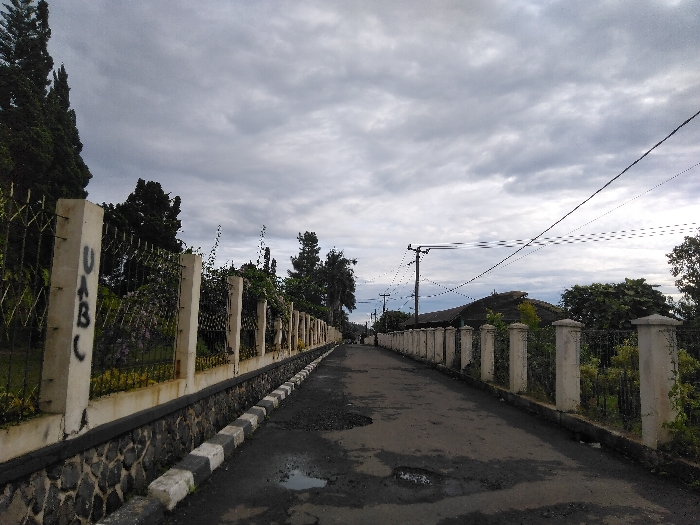 The image captures an upward-sloping asphalt road under a heavily overcast, gray sky, situated in the city of Hafjell, Norway. The road surface exhibits extensive wear, including visible potholes, patches, and small puddles. On the left, a low curb with alternating black and white stripes borders a dark stone retaining wall, which is topped by a continuous black cap. Above this, a fence is constructed from regularly spaced light-colored concrete posts connected by a dark metal mesh. The foremost visible concrete post on the left bears vertical black graffiti reading "UABC". Behind this fence, a dense growth of tall, dark green coniferous trees is prominent. The right side of the road features a similar concrete post fence, behind which lush green foliage and broadleaf trees obscure the view. Further down the road on the right, the dark roof of a building is partially visible. Overhead, multiple utility wires are strung between dark utility poles, one of which stands prominently on the right. No individuals, vehicles, or apparent activity are present.