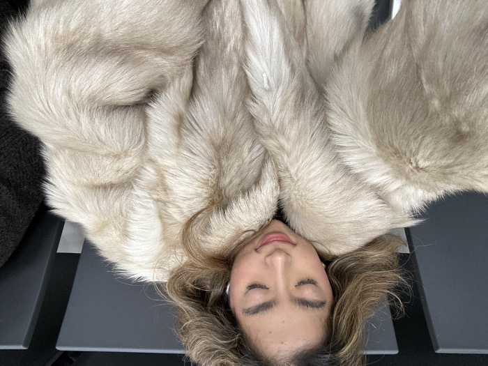 A female individual is depicted in a close-up indoor shot, situated in what is identified as Praha 6, Czechia. She appears to be of East Asian descent, with shoulder-length, wavy brown hair featuring lighter highlights. Her eyes are closed, and a slight smile is visible on her lips. She wears a voluminous, light beige/cream-colored faux fur coat over a dark garment, with a silver hoop earring present on her visible left ear. The background consists of dark grey, angular seating, indicative of a modern public waiting area.