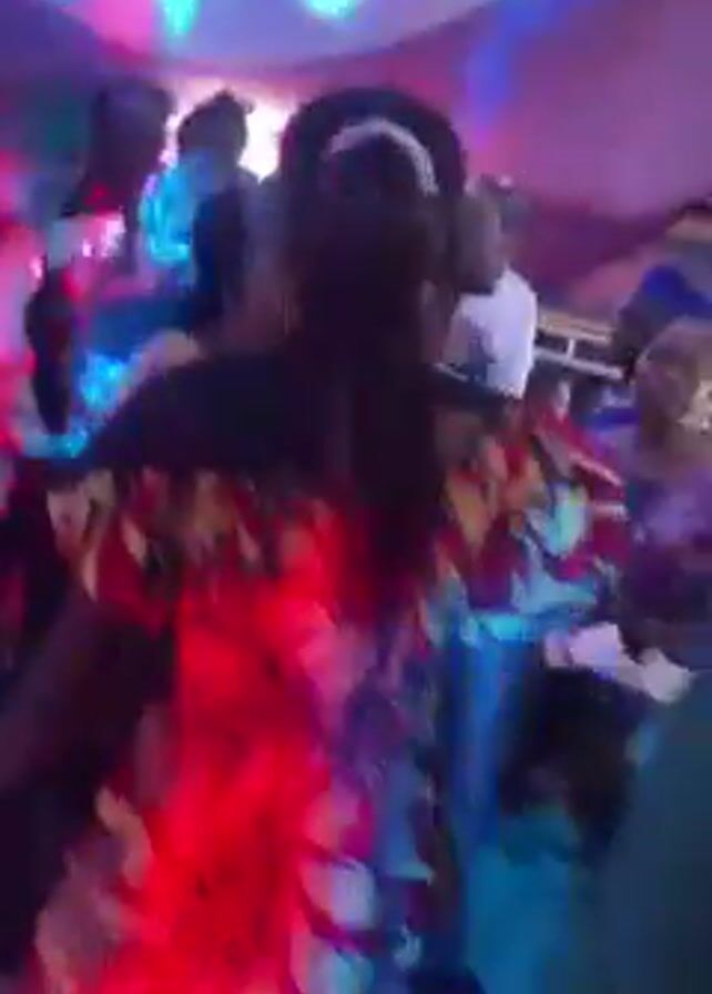 group of people dancing at what appears to be a party. They are dressed in colorful traditional African clothing. There are flashing lights in the background, creating a vibrant atmosphere. A person in a light-colored shirt and patterned hat is prominent in the foreground. The camera is moving, making the scene look dynamic and energetic.
