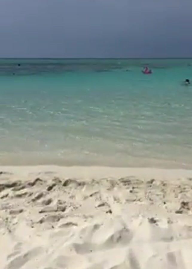 beach scene from a first-person perspective, with the camera focused on the person's feet initially covered in sand. The camera then pans up to reveal the turquoise ocean and white sand beach. People are swimming in the water and enjoying the beach. The sky is overcast, but the overall scene is bright. The camera pans from right to left along the beach. The person has an ankle bracelet on their left ankle.