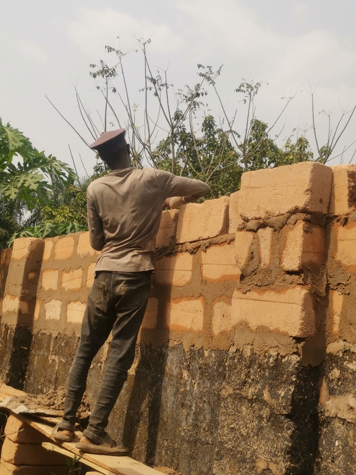 In Agbor, Nigeria, a male individual is depicted from behind, actively engaged in construction work