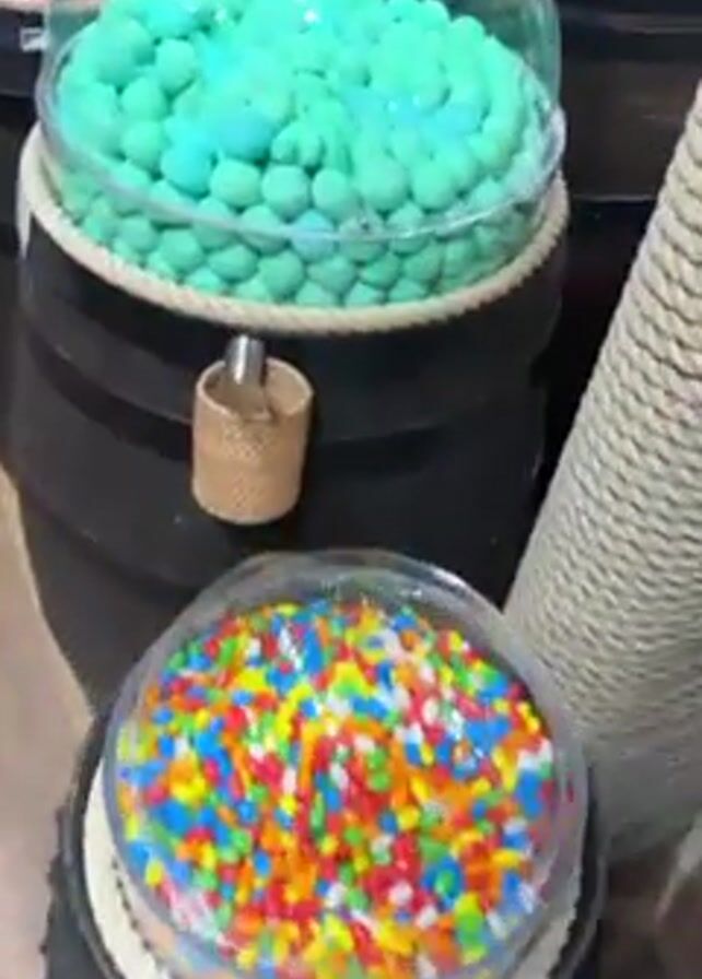 candy store with various candies displayed in barrels. The barrels are dark brown with a rope detail around the top. The candies are of different colors and types, covered with a clear dome. Some of the candy are blue, multicolored, gray, red, yellow, and mixed. There are wooden boxes displayed on the wall containing candies, and candies on wall display shelves. The floor is light wood.