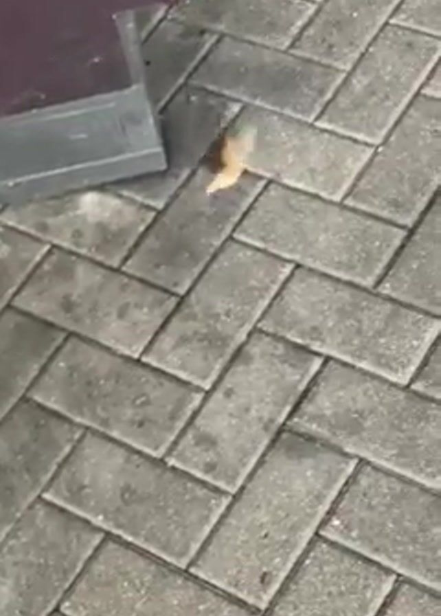 small bird lying on a gray brick pathway. The bird has brown and yellow feathers and appears to be injured or unable to move. The pathway is made of herringbone-patterned bricks. There's a dark-colored object, possibly a container or part of a building, near the bird. Traffic noise is audible in the background. The camera zooms in slightly on the bird.