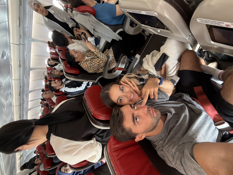 The image displays the interior of a commercial passenger aircraft, specifically within the economy class cabin, at Kuala Lumpur International Airport (KLIA) in Sepang, Malaysia. The cabin is densely populated with passengers seated in red-upholstered seats. In the foreground, a male and female are positioned to take a selfie. The male, on the left, has short dark hair, stubble, and wears a grey t-shirt and black shorts, with a red seatbelt across his lap. He is looking upwards and to the right with an expressive facial gesture, his left index finger touching his right temple. A blue wristband or watch is on his left wrist. The female, on the right and slightly behind him, has long dark hair and a wide smile. She wears a plaid shirt and leans against the male's shoulder, her right hand raised near her face, forming a two-finger gesture. A white blanket or towel and a black smartphone are visible on the male's lap. Immediately in front of the foreground subjects, the back of a female passenger's head, with dark hair in a ponytail, is visible. Beyond this, rows of passengers occupy the cabin. On the right side, a female with glasses, wearing a patterned yellow, black, and white shirt, is engaged with a smartphone. Further back and to the right, a person in a white long-sleeved shirt and a light head covering is standing in the aisle, leaning forward. Various other passengers, including individuals with dark and light hair, beards, and headscarves, are seated throughout the visible section of the aircraft. Overhead bins and the internal structure of the aircraft are visible above the seats. The scene depicts a moment either during boarding, disembarking, or while the aircraft is stationary on the tarmac at KLIA.