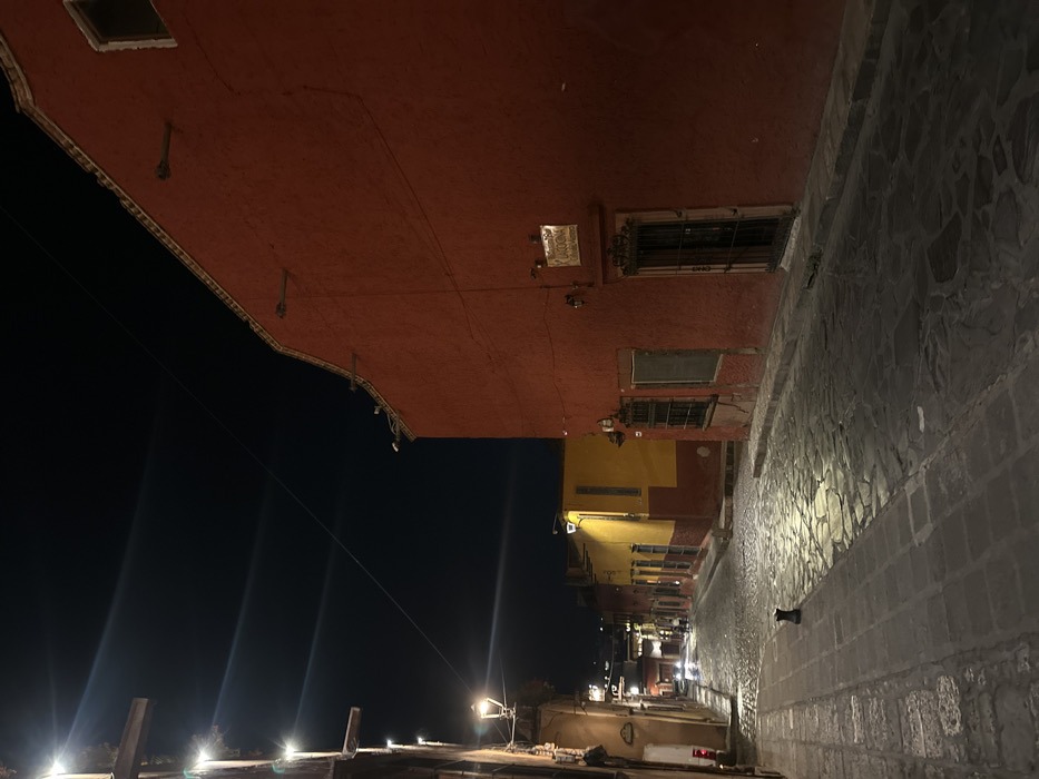 A narrow, illuminated street scene at night. A stone wall runs along the right, juxtaposed with colorful buildings on the left featuring windows and a red overhang. Streetlights illuminate the path below, with a dark, cloudless sky above. The buildings display a mix of architectural styles. The perspective is slightly skewed.