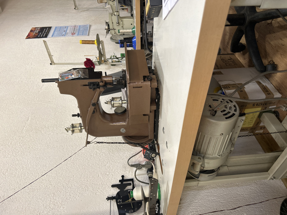 The image depicts an interior view of an industrial workshop located in Rudozem, Bulgaria. A prominent brown industrial sewing machine is positioned in the foreground on a light-colored workbench featuring a light wood trim. The machine displays multiple metal components, including two visible oilers, a thread guide, and a hanging chain on its left side. A thin black thread extends upwards from the machine's left. A CE marking is visible on the machine's body, and a red artificial rose is tucked into its upper frame. Underneath the workbench, a light-grey electric motor is mounted. Stacked cardboard boxes and the base of a black office chair are partially visible beneath the table. To the left of the main machine, a white spool of thread rests on a metal stand, and power outlets with connected cords are affixed to a textured white wall. In the background, another industrial sewing machine, lighter in color, is situated on an adjacent workbench. Several spools of thread in yellow, green, and blue are visible on thread stands. A wall calendar, partially showing "2023" and "FEBRUARI," hangs on the background wall. No individuals are present in the scene.
