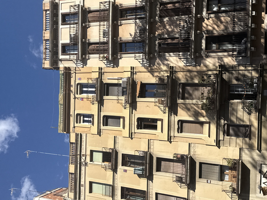 - "The image displays a vertical view of three adjacent, multi-story residential buildings under a clear blue sky with scattered white clouds, characteristic of urban architecture in Barcelona, Spain" by FM-E64Cl2, licensed under CC BY 4.0