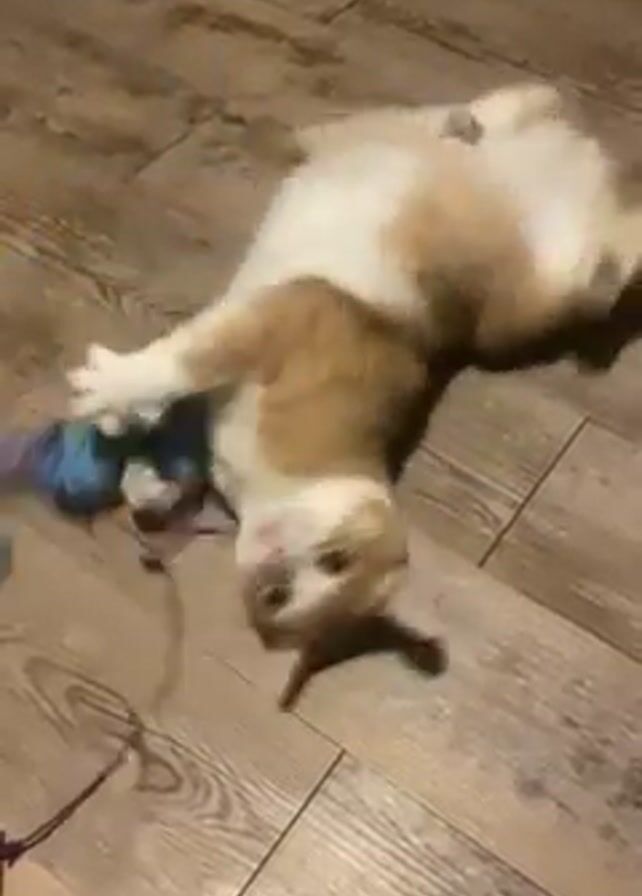 - "On a brown, wood-patterned floor, an orange and white cat lies on its back and plays with a plush, blue, toy lizard" by FM-xTDQG2, licensed under CC BY 4.0