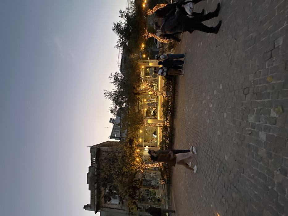 The scene depicts Avissinias Square in Athens, Greece, during twilight. The sky transitions from deep blue overhead to a pale orange hue near the horizon. The ground is entirely paved with uneven, dark-toned cobblestones. To the left, an aged, multi-story building with a weathered facade is visible, featuring extensive graffiti on its lower wall. Adjacent to this structure is a modern cafe characterized by large glass windows, a brightly illuminated interior, and an extensive outdoor seating area furnished with dark tables and chairs. Several trees positioned in front of the cafe are intricately wrapped with warm white string lights. Similar string lights adorn two large, decorative, reindeer-shaped structures located on the far right side of the square. Above the cafe, parts of another building are visible, including rooftop solar water heaters. In the foreground, center-left, a couple walks across the cobbled square. Mid-ground, a group of approximately five people stands conversing near the cafe's outdoor seating. To the far right, additional pedestrians are in motion, passing the illuminated reindeer decorations. Inside the brightly lit cafe, indistinct figures are visible through the glass.