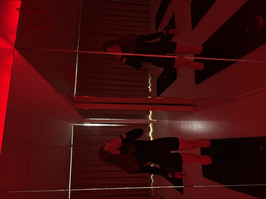 A woman in a black bodysuit stands in a room with mirrored walls. The lighting is intensely red, and her reflection is visible in the mirrors. One wall features a black and white zigzag pattern. The room appears to be small and enclosed, possibly a dressing room or fitting area. The woman is holding a phone, seemingly taking a selfie.