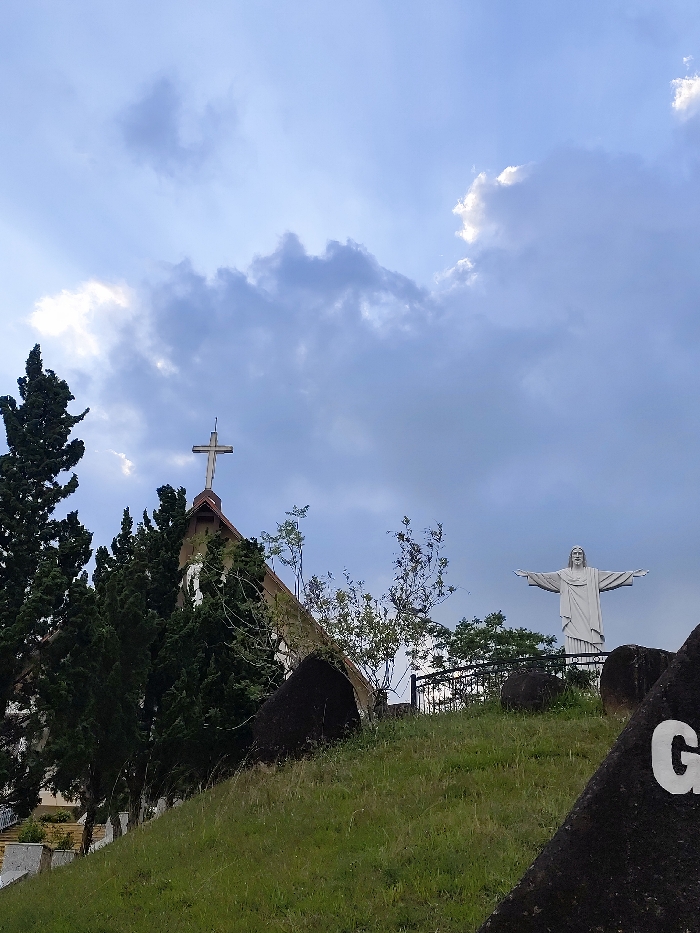 The image displays an elevated outdoor scene in Dalat, Vietnam, under a partially cloudy sky. The foreground and midground consist of a sloping, grassy hillside dotted with several large, dark, irregular rocks; one rock in the far right foreground bears a partial white letter "G". To the left midground, partially obscured by tall, dark green coniferous trees, is the Domaine de Marie Church, identifiable by its steeply pitched brown roof and a white Latin cross topped with a lightning rod. Further to the right and higher on the hill, behind a dark metal fence, stands a large, white statue of Jesus Christ with outstretched arms. The sky above is blue with scattered grey and white clouds. No people are visible.