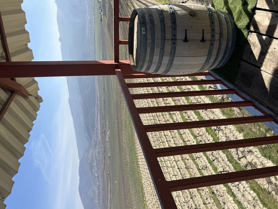 The image depicts a panoramic view from an elevated open-air structure, likely a balcony or viewing platform, located in the city of Ustina, Bulgaria. In the immediate foreground, a red-painted metal railing runs horizontally, obscuring the lowest portion of the scene. To the right, a vertical red-painted support beam anchors a light-colored corrugated metal roof structure, which is partially visible at the top. Below the beam, on the platform floor, a large wooden wine barrel with multiple metal hoops and a small hinged door on its side is positioned on a patch of artificial green turf. The platform floor consists of wooden planks, visible around the barrel and beneath the railing. Beyond the railing, an extensive vineyard dominates the midground. Rows of dormant grapevines with exposed dark woody branches are neatly arranged across light brown soil, interspersed with strips of green vegetation. The rows recede towards the horizon. In the far background, a wide valley unfolds, featuring a small town with numerous buildings nestled at the base of prominent, hazy blue-grey mountains that stretch across the entire frame. The sky above is clear and bright blue, indicative of a sunny day with minimal cloud cover, and sunlight casts distinct shadows on the wooden platform. No individuals are present in the scene.