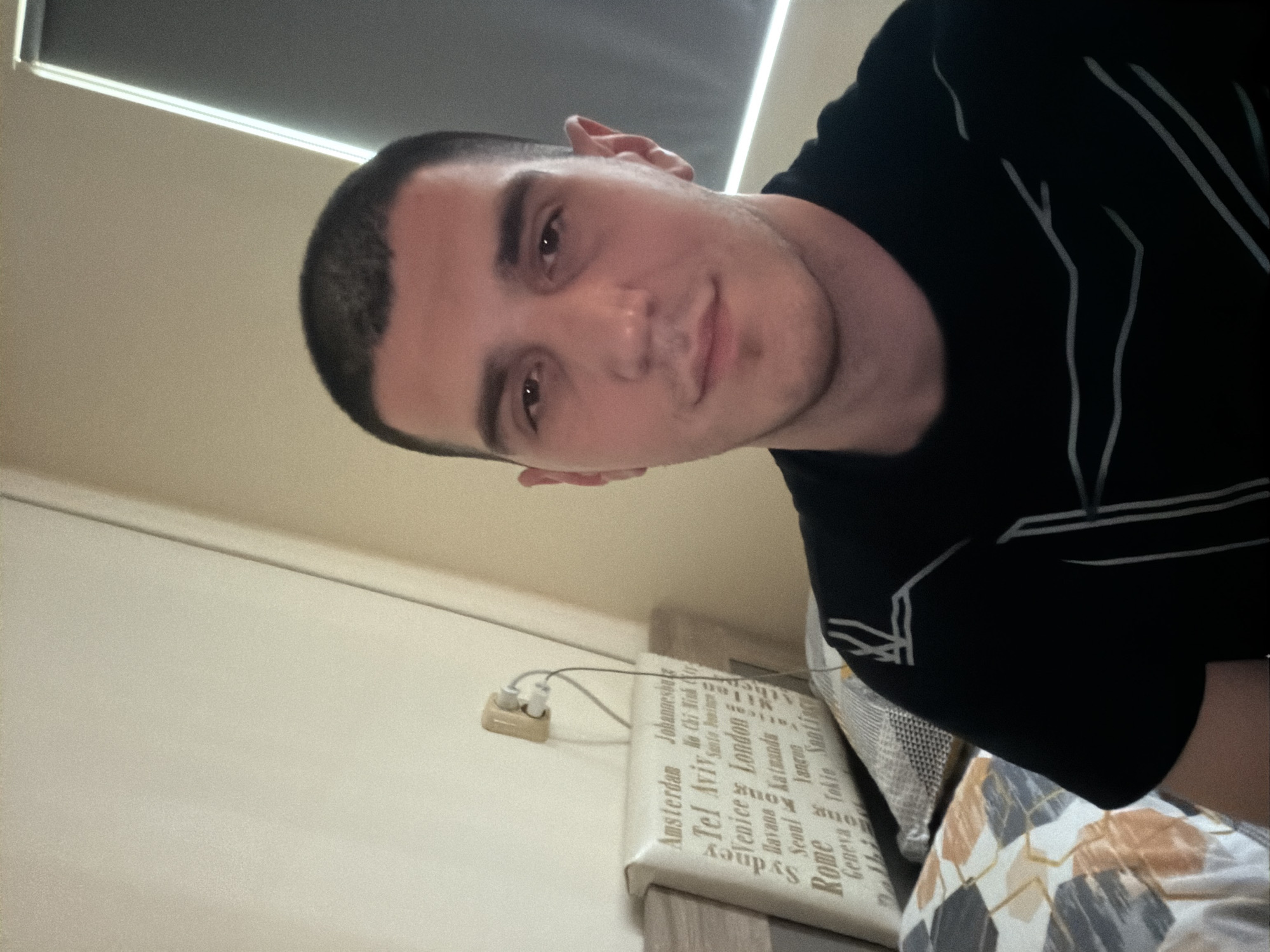 A male individual is depicted in a medium close-up, facing the camera directly, within an indoor setting in Burgas, Bulgaria. The subject has short, dark hair, a clean-shaven face with a small soul patch, and dark eyes. He is wearing a black t-shirt adorned with thin, light-colored, abstract linear patterns. The background consists of light-colored walls. To the subject's right, a dark window or door with a reflective vertical frame is partially visible. To the subject's left, a light-colored wooden headboard of a bed is present. Against the headboard, a rectangular decorative pillow displays various international city names including "Amsterdam," "Johannesburg," "Tel Aviv," "Venice," "London," "Sydney," "Rome," "Seoul," "Geneva," "Havana," "Kathmandu," "Tokyo," and "Santiago." Below this, a portion of bedding featuring a geometric pattern in grey, white, and orange is visible. An electrical outlet with a charger plugged into it, from which a dark cable extends, is mounted on the wall above the headboard. The scene is illuminated by diffused light.