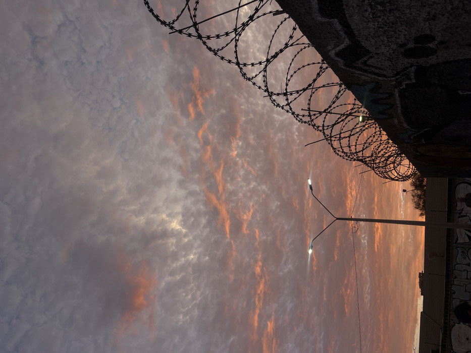 A low-angle shot features barbed wire against a dusk sky, with pink and gray hues in the clouds. A streetlight with two illuminated bulbs stands near the barbed wire. The edge of a structure, possibly a building or wall, runs along the top edge of the image, decorated with graffiti and concrete. The angle of the shot and elements like barbed wire create a sense of tension.