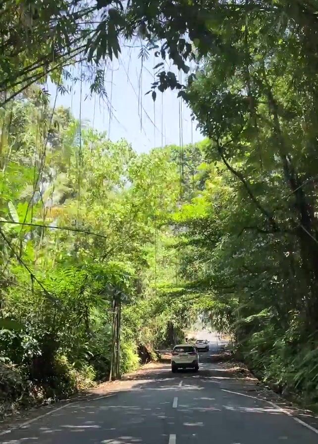 car driving down a narrow asphalt road, lined on both sides by dense green trees and foliage. The trees form a natural archway over the road, creating a tunnel-like effect. Patches of blue sky are visible through the canopy. In the distance, another car is visible ahead of the camera car. A white dividing line runs down the center of the road. There are utility poles and dangling vines visible among the foliage on the sides of the road. The weather appears to be sunny. The camera appears to be mounted inside a vehicle.