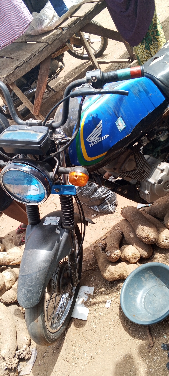 - "This image depicts a market scene in Doma, Nigeria, focusing on the front and side of a blue Honda motorcycle parked on a dirt ground" by FM-SODWY2, licensed under CC BY 4.0