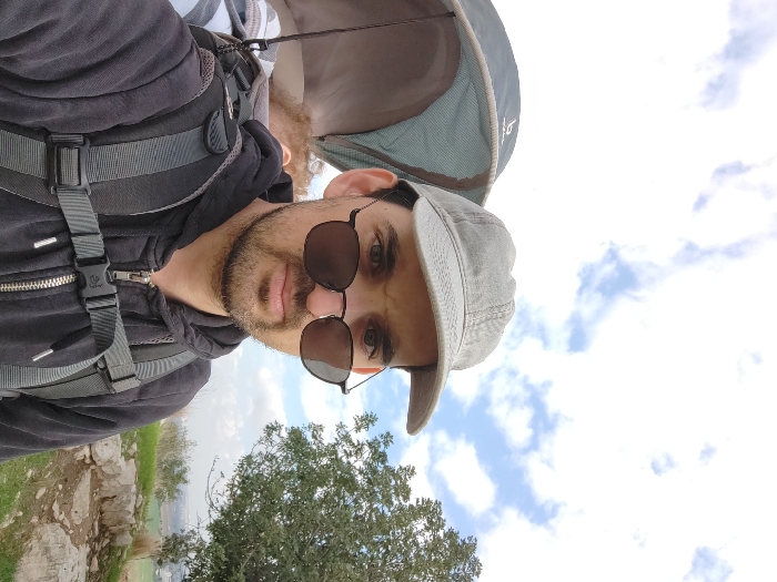 The image depicts an outdoor selfie taken in Rosh HaAyin, Israel, from an elevated perspective
