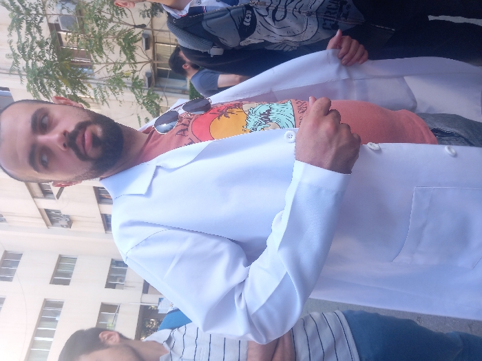 An outdoor scene in Al-Mazza Municipality, Syria, depicts a male subject in the foreground, facing the camera and looking right. He has a dark beard and wears a white lab coat unbuttoned over a salmon-colored t-shirt with a graphic design of a beach scene. Sunglasses are attached to his shirt collar. His hands hold the lapels of the lab coat open. To his left, a partially visible male wears a striped shirt and blue jeans, carrying a blue backpack. To his right, another partially visible male wears a dark, graphic hoodie. The background features a multi-story light-colored building with numerous windows and an air conditioning unit, along with a green tree. Additional indistinct figures are present further back.