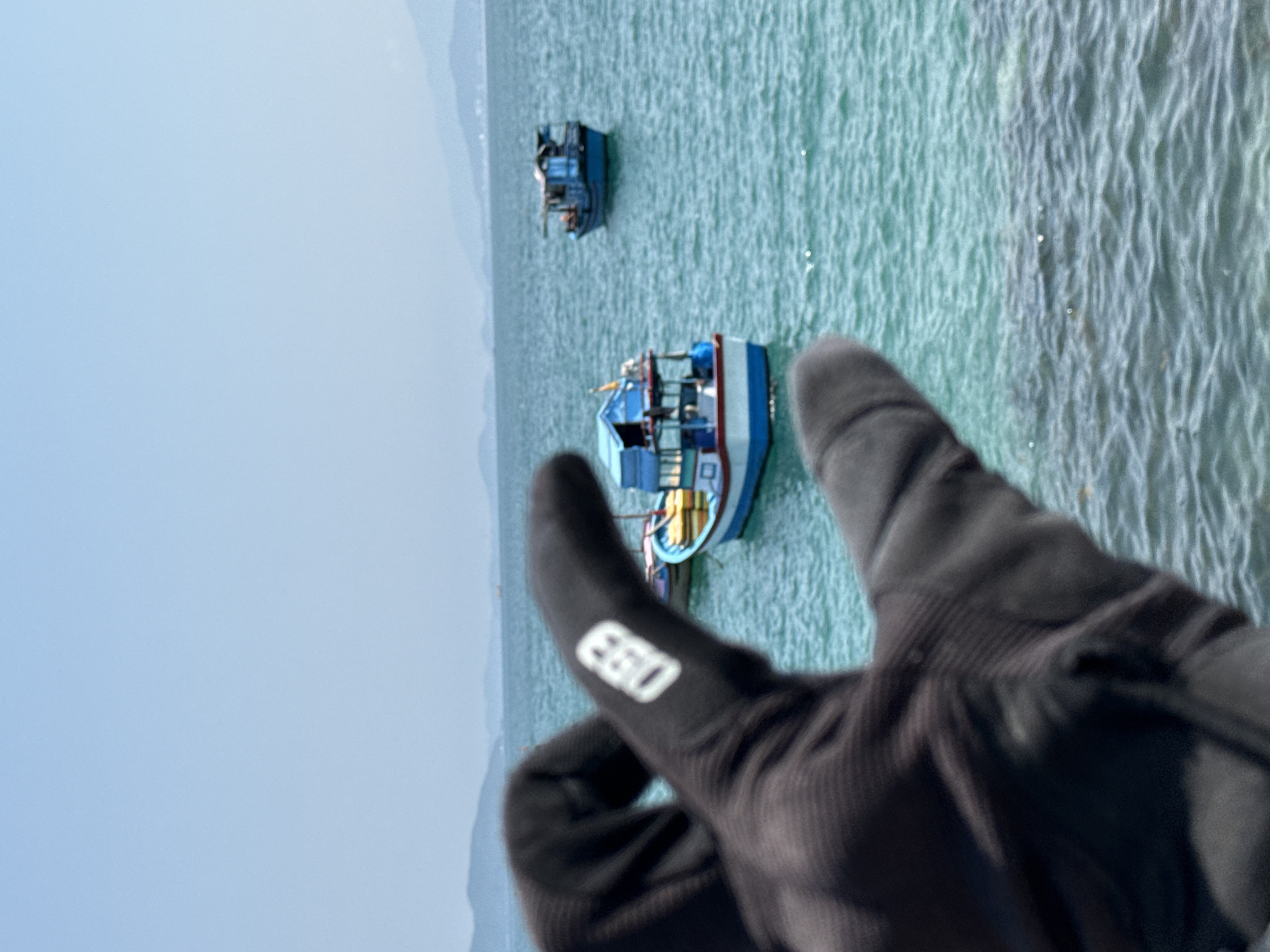 The image captures a coastal scene, likely in Bắc Nha Trang, Vietnam. Two fishing boats are visible on the water's surface. In the foreground, a gloved hand partially obscures the view of the boats and the sea. The water has a light green hue. The sky is clear blue, with a faint suggestion of mountains in the distance.