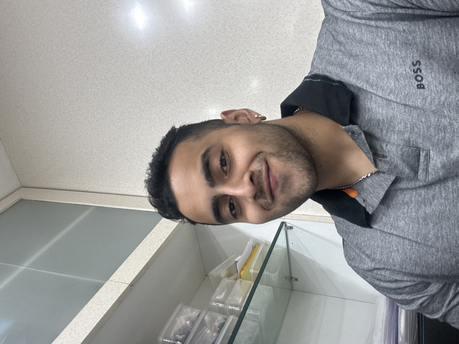 A male individual, appearing to be in his twenties to early thirties, is depicted in a medium shot, smiling directly at the camera. He has short, dark hair, light brown eyes, and facial stubble. He is wearing a grey short-sleeved polo shirt featuring a black collar and an interior orange placket. The word "BOSS" is visible in black lettering on the right chest area of the shirt. A silver-colored chain is around his neck, and a small gold-colored hoop earring is present in his right earlobe. The background, located in Kolkata, India, indicates an indoor commercial or office environment. To the left, a white shelving unit with two glass shelves is visible. The top shelf holds several transparent plastic containers filled with small items, while the lower shelf displays stacks of yellow and white papers or fabric. Above the shelving unit, a cabinet with a frosted or opaque glass door is present within a white frame. The walls are light-colored, and light reflections are visible on the right wall, suggesting overhead lighting. No other individuals or specific actions are depicted.