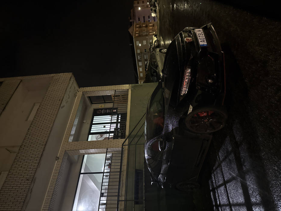 A black Honda Civic Type R is parked on a wet street next to a two-story building with a white brick facade and large windows. The building appears to house a business. The car's license plate reads "AG73LF". A multi-story residential building is visible in the background. The scene is illuminated by streetlights, and the overall atmosphere is dark and somewhat wet.