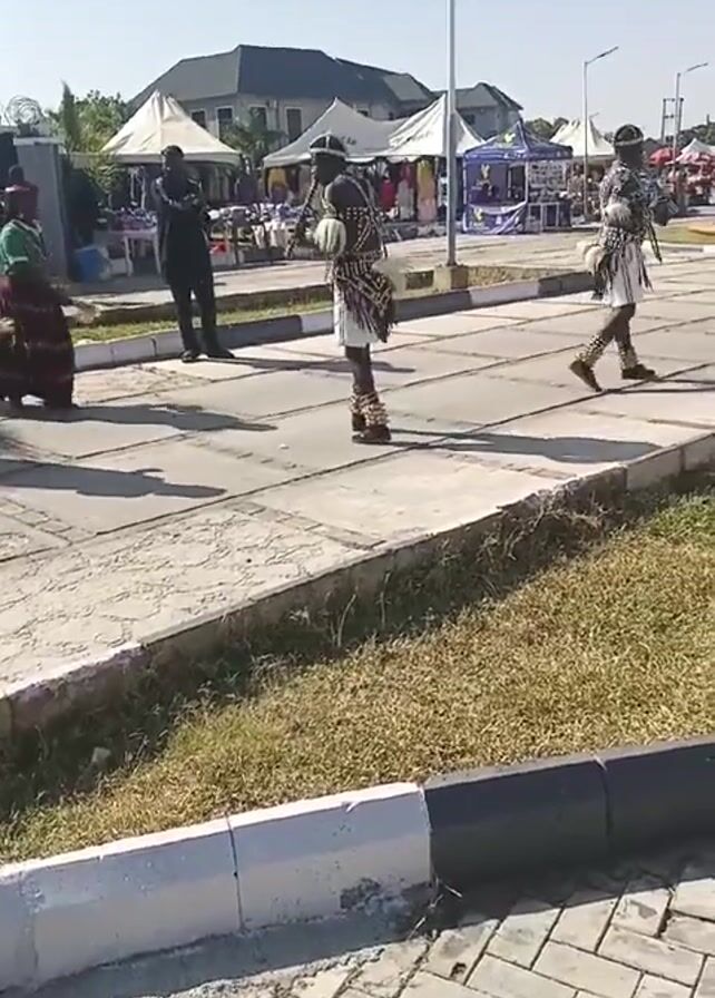 procession of people in a paved outdoor area. Two men in traditional attire with beaded vests, white shorts, and ankle bracelets stand on the right side of the frame, facing away from the camera. To their left, a group of women in green shirts and patterned skirts, also in traditional attire, move towards the left side of the frame, seemingly dancing. A man in black stands between them and the women. In the background, white tents and a building with a dark roof suggest a market or event setting. The ground is a mix of paved areas, patches of grass, and a curb painted in white and black. The sky is clear, indicating a sunny day.