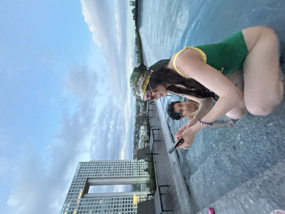 A forensic description of the image reveals a rooftop infinity pool scene overlooking a section of Mexico City. The prominent building in the background, a multi-story structure with a distinctive large rectangular central void, is identified as Torre Arcos Bosques I, commonly known as "El Pantalón," situating the location in the Bosques de las Lomas district of Mexico City. In the foreground, a female individual with long dark hair, wearing a green and yellow one-piece swimsuit, gold-rimmed sunglasses, and a patterned dark green and yellow bandana tied around her head, is crouched in the pool. She holds a black smartphone horizontally with both hands, appearing to interact with its screen. A blue beaded bracelet is visible on her left wrist. Her head is tilted slightly down towards the phone, and her mouth is partially open. Behind her, partially submerged in the pool, is a male individual with dark, curly hair and a light-colored necklace, looking towards the camera. The pool features grey tiled edges and a clear, reflective water surface. To the left of the pool, a wooden deck is visible with several dark-colored lounge chairs. The distant cityscape extends under an overcast sky with light blue and grey clouds, suggesting either early morning or late afternoon light conditions. Beyond the immediate buildings, a sprawling urban environment is discernible across the horizon.