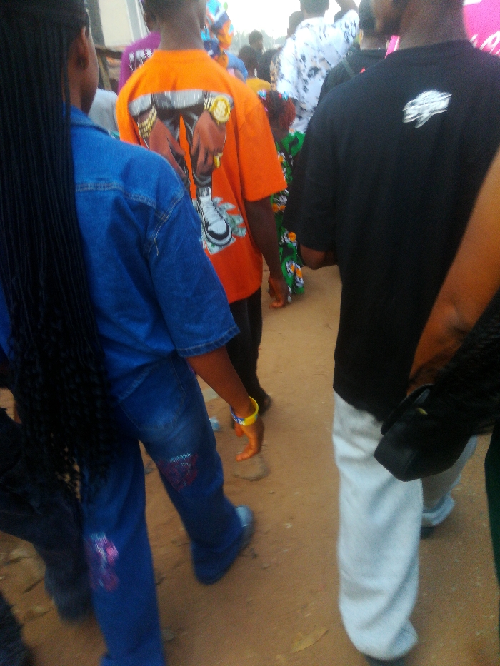 A group of people stand together on a dirt ground. A person with long braids wears a blue denim shirt and pants. Another person in an orange t-shirt with a graphic design stands in front. A person to the right wears a black shirt and white pants. Other people with different colors of clothing are in the background.