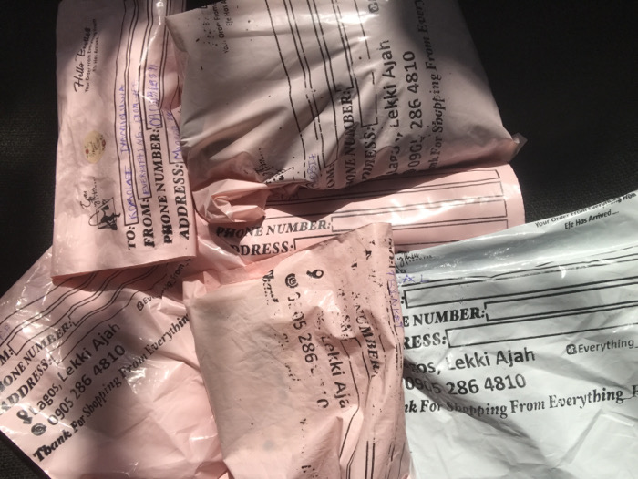 The image displays a close-up view of approximately six to seven crumpled plastic mailing bags, predominantly pink, with one white bag partially visible at the lower right, resting on a dark, unidentifiable surface. The bags are consumer packages, identified as originating from "Everything" by recurring pre-printed text such as "Your Order From Everything" and "@Everything_". Each visible bag features pre-printed fields for delivery information. Multiple bags clearly show "ADDRESS: Lagos, Lekki Ajah" and a consistent handwritten phone number "0905 286 4810." One pink bag is addressed "TO: KOKOALAT" with a handwritten phone number "09050518811" and an illegible address. Another pink bag has "TO: TYANNISHA." The white bag at the bottom right displays the text "Your Order From Everything Efe Has Arrived." The bags appear to have been handled, exhibiting creases and slight discoloration consistent with use or storage. Bright, possibly natural, light illuminates the scene from the upper left, casting subtle shadows. The objects are located in Badore, Nigeria. No individuals are present.